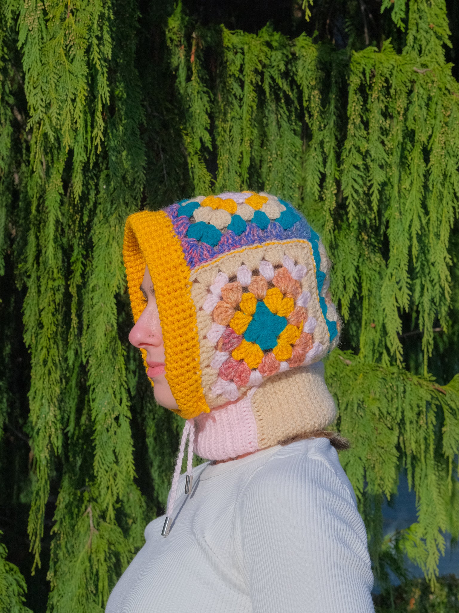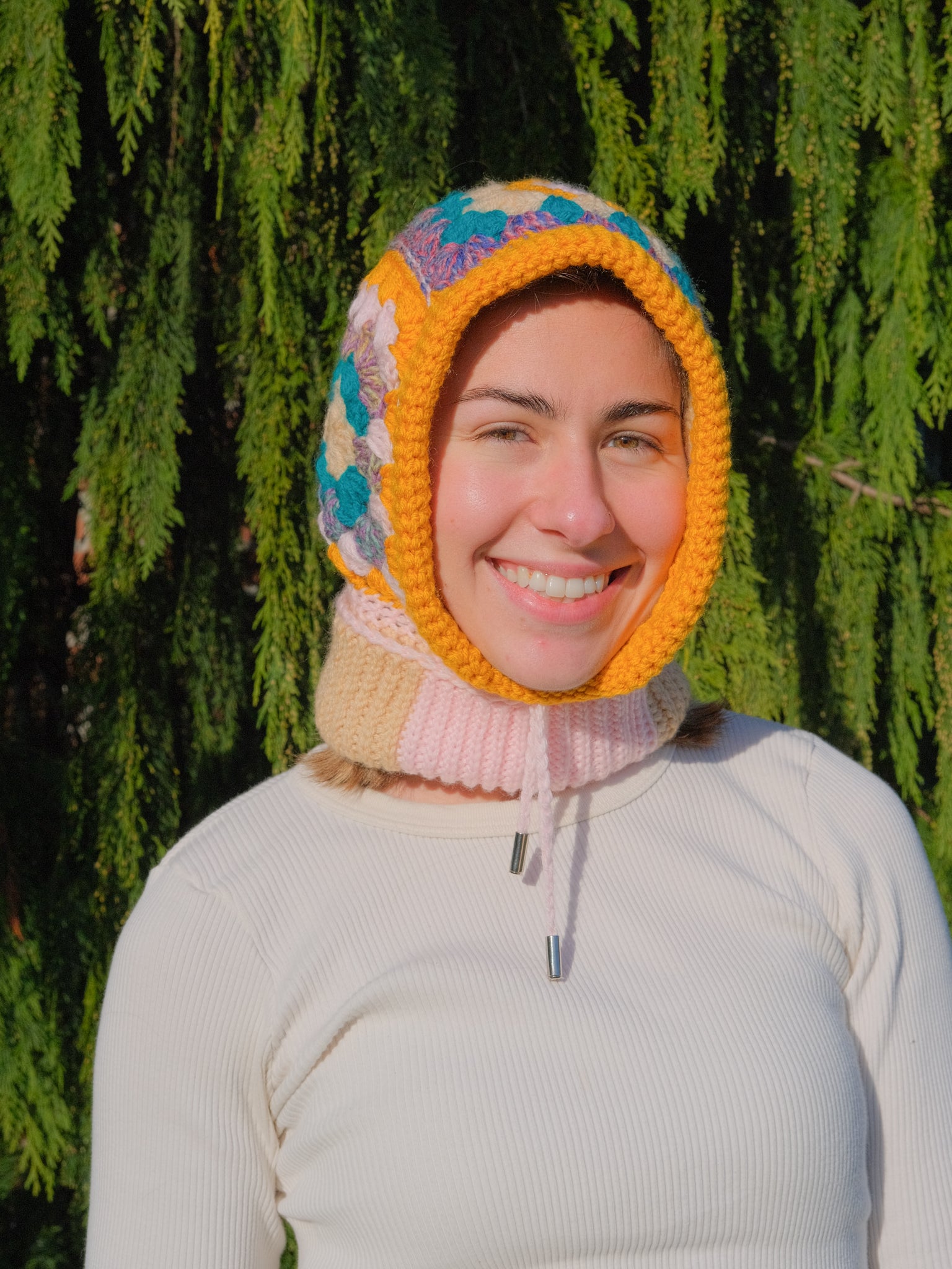 This cozy balaclava is carefully crafted with a blend of cotton and acrylic yarns and finished with durable metal aglets. A built-in drawstring allows for a more snug fit if desired– perfect for the winter weather!
