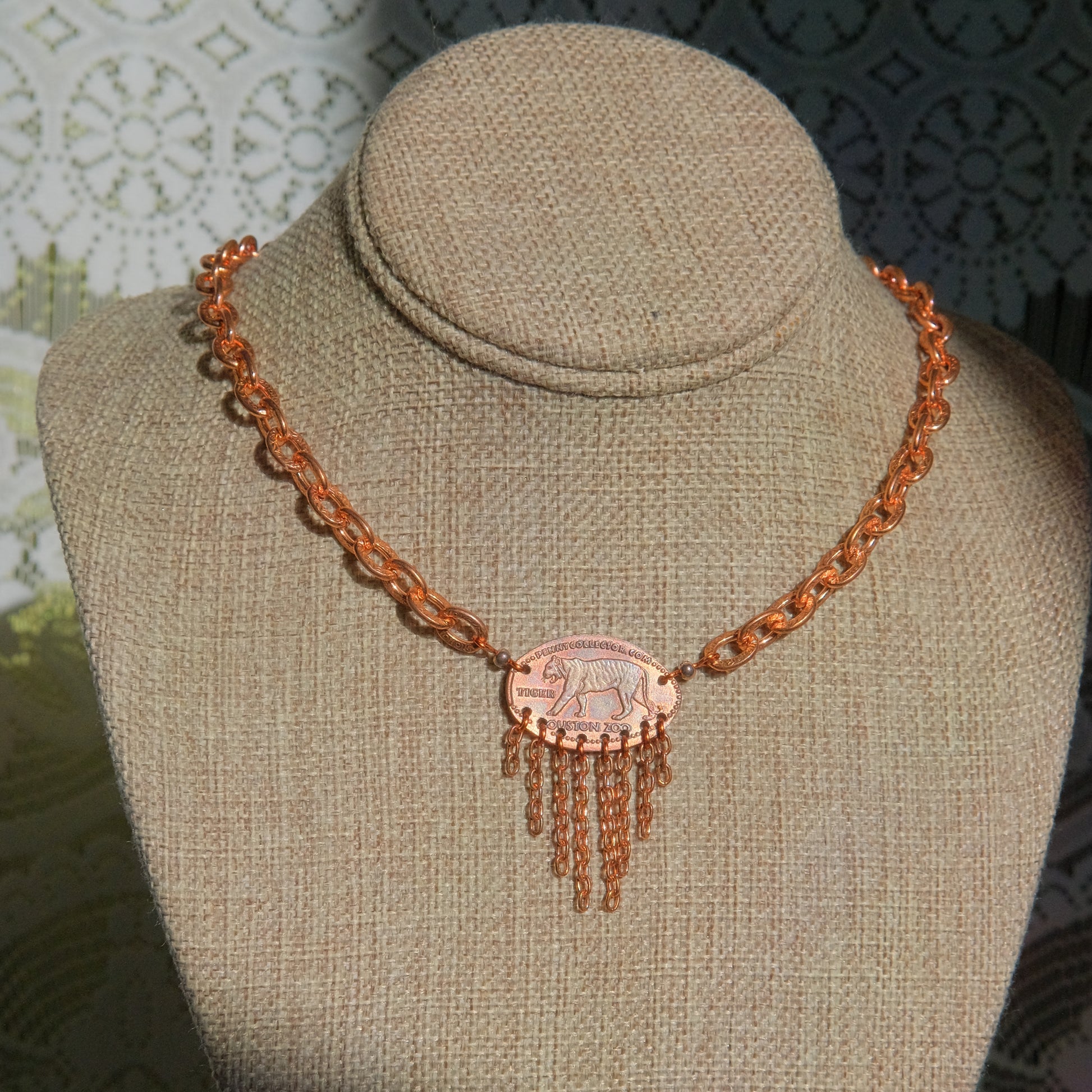 This necklace features a repurposed pressed penny from the Houston Zoo and pure copper chain.